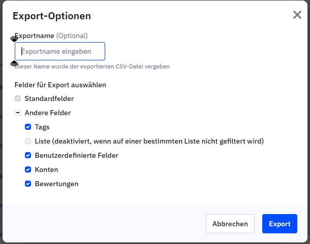 Der Export wird nun gestartet. Sobald dieser abgeschlossen ist, kannst du die generierte CSV-Datei herunterladen. Den Status vom Export (und den Download) findest du jederzeit im Seitenmenü unter "Kontakte" > "Exporte" (im weißen Untermenü).